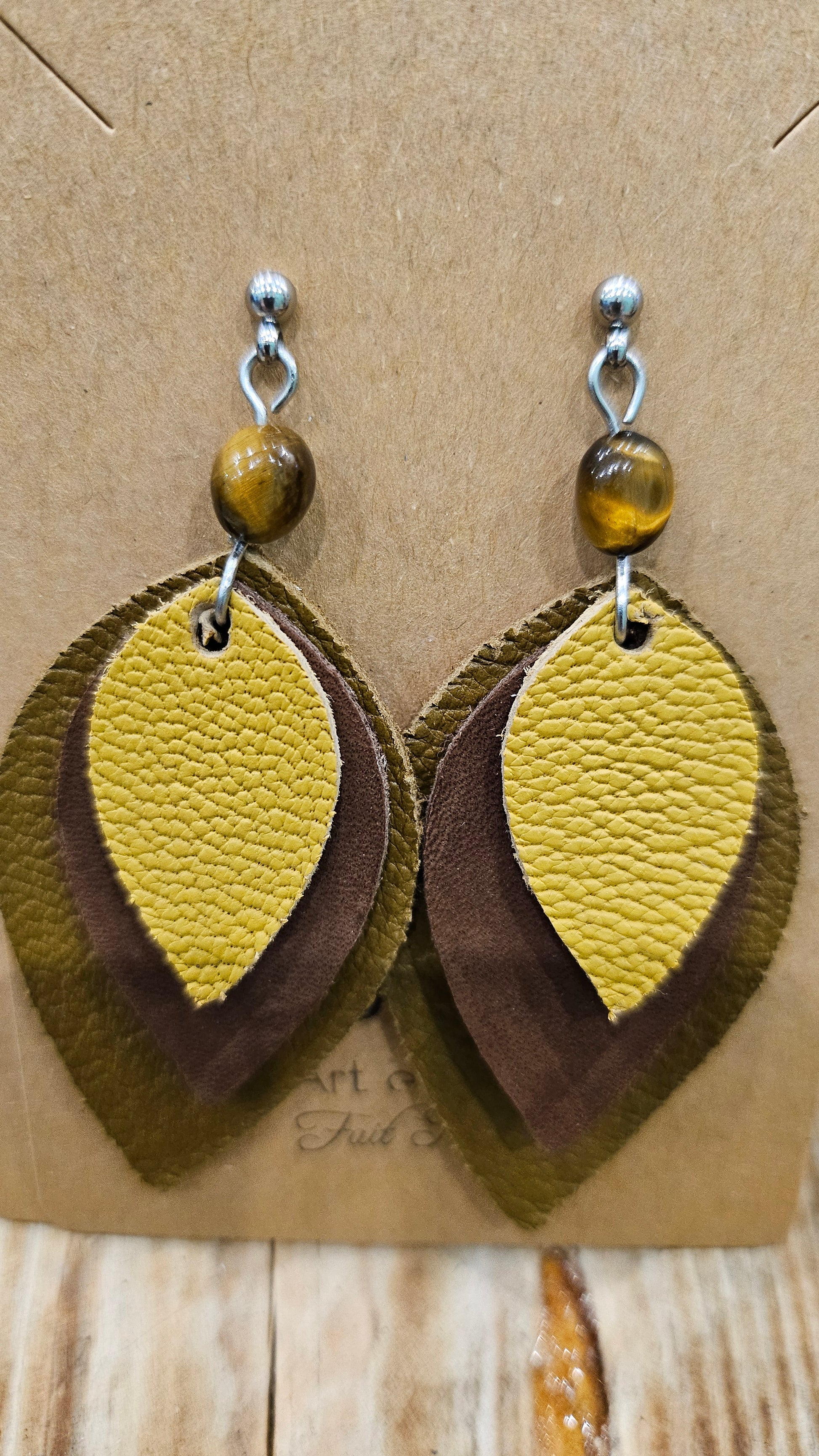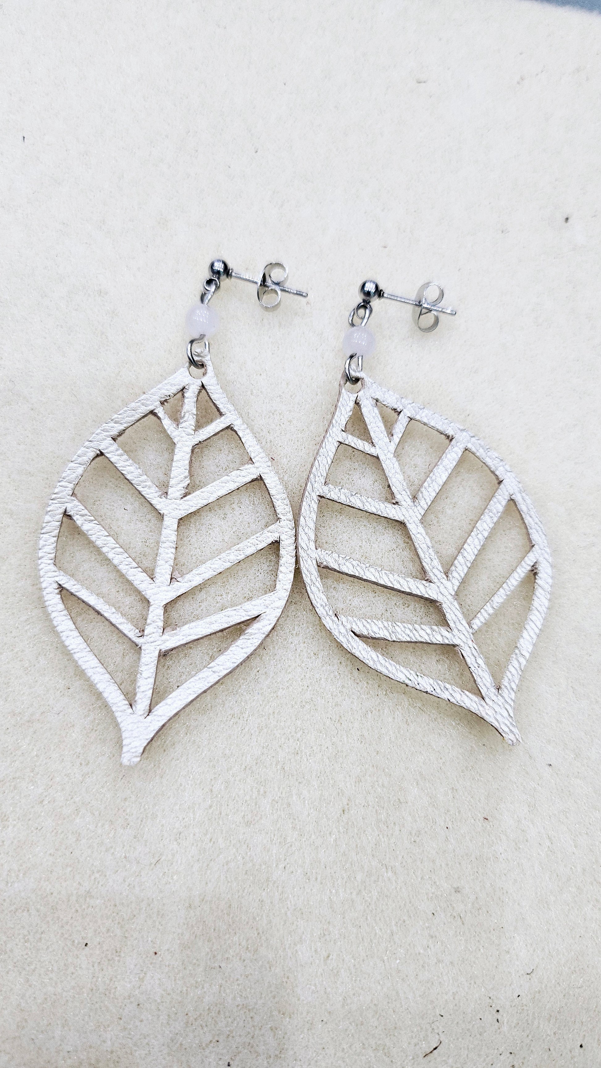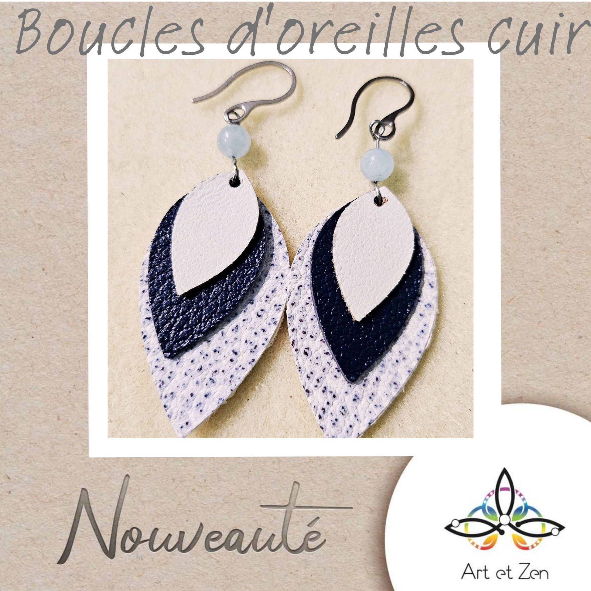 La paire de boucles d'oreilles contient des boucles en acier inoxydable argenté ou doré, des pierres fines véritables et sont ornées de cuir taillés directement à la boutique. Chaque paire est unique.